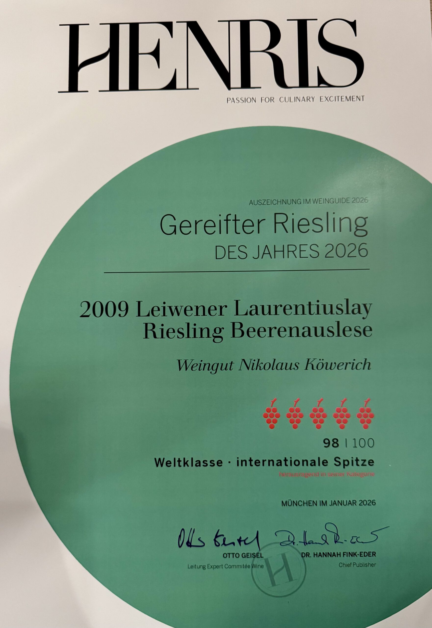 Henris wählt unsere 2009 Leiwener Laurentiuslay Riesling Beerenauslese zum Gereiften Riesling des Jahres. Er wurde mit 98 Punkten bewertet und somit zur „Weltklasse – internationalen Spitze“ gezählt.